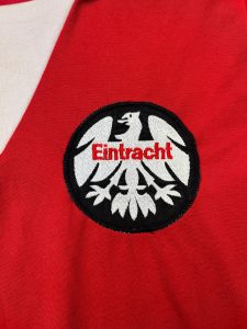Club Badge: Embroidered patch with bold black outline, white eagle background, and red “Eintracht” text across the chest.