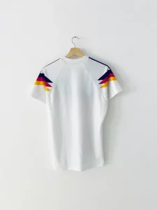 This shirt was worn throughout the 1990 World Cup in Italy, culminating in West Germany’s 1–0 win over Argentina in the final. It remained in use during the early matches of unified Germany before the 1992 redesign.