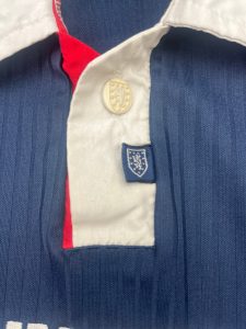 Watch for bootlegs missing the collar button detail or featuring printed Umbro logos. The internal double button system and rubberised lower front motif are key identifiers. Replica shirts tend to have a boxier fit and slightly different fabric sheen than match-issue versions.