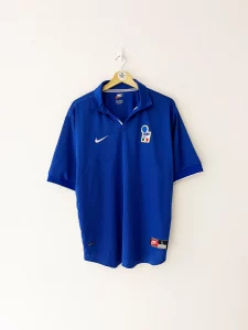 The Italy 1998 Home Shirt was worn during the team’s run at the 1998 FIFA World Cup in France. Under Cesare Maldini, Italy topped their group before being eliminated on penalties by France in the quarter-finals after a 0–0 draw. Christian Vieri starred with five goals, while Roberto Baggio made a final World Cup appearance. The kit is remembered for its simplicity and elegance, and it marked Nike’s first venture into designing Azzurri shirts.