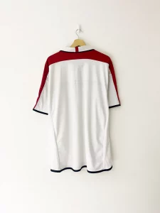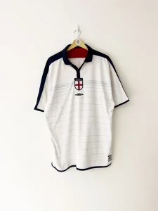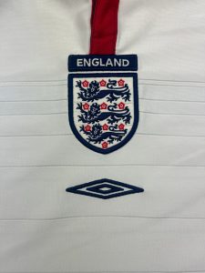 The England 2004 home shirt by Umbro introduced a modernised design with asymmetric red shoulder trim and sharp tailoring, while maintaining traditional white as the dominant colour. Worn during England’s Euro 2004 campaign, this shirt is closely linked with Wayne Rooney’s tournament breakout and the dramatic quarter-final loss to Portugal. It marked a shift toward sleeker silhouettes and performance-focused construction.