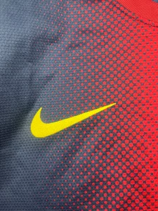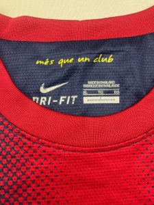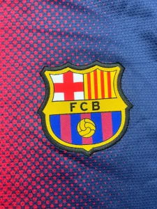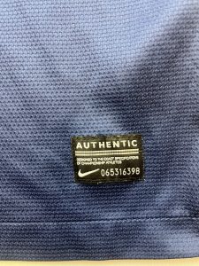 Fake versions often have an incorrect gradient fade or dull stitching on the crest. Be sure the dot pattern transitions smoothly across the chest, and the “més que un club” and Dri-FIT neck print is crisp. The black Nike Authentic patch with a serial number is a crucial verification point.