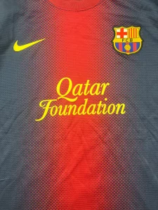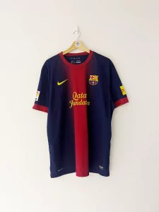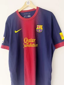 Barcelona won La Liga with a record-tying 100 points under new manager Tito Vilanova. Lionel Messi scored 46 league goals. This shirt marked the first season with Qatar Foundation as the main front sponsor.