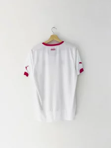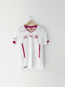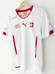 The Switzerland 2014 Away Shirt, produced by Puma, is a clean and modern design featuring a white base with red detailing. Worn during the 2014 FIFA World Cup in Brazil, it was used in matches such as the group-stage clash against Honduras. Known authentication issues include peeling of the Puma logos, fading of the micro-dotted fabric pattern, and replicas missing the embossed Swiss cross texture across the fabric.