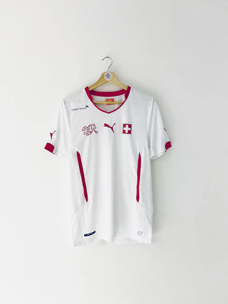 The Switzerland 2014 Away Shirt, produced by Puma, is a clean and modern design featuring a white base with red detailing. Worn during the 2014 FIFA World Cup in Brazil, it was used in matches such as the group-stage clash against Honduras. Known authentication issues include peeling of the Puma logos, fading of the micro-dotted fabric pattern, and replicas missing the embossed Swiss cross texture across the fabric.