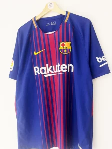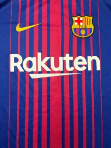 The 2017–18 Barcelona home shirt is widely counterfeited, especially due to its popularity as the first season featuring the Rakuten sponsor. Key indicators of authenticity include:
