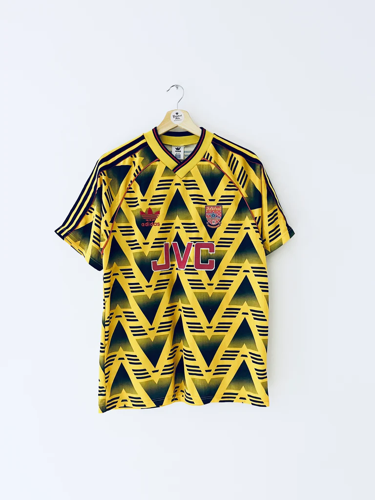 1991–93 Arsenal Away Shirt – Authentication Guide⸻Shirt OverviewTeam: ArsenalSeason: 1991–93Type: AwayManufacturer: AdidasPrimary Colour: Yellow with navy ‘bruised banana’ graphicNotable Match: Liverpool vs. Arsenal (1991–92), various away games in Division One ⸻Key Authentication FeaturesPattern: The iconic “bruised banana” sublimated design—featuring sharp navy zigzag arrows on a yellow base. Look for clear edges and slight variation in…