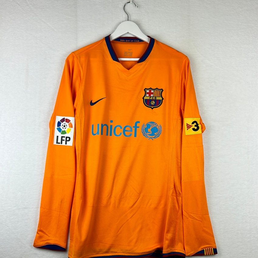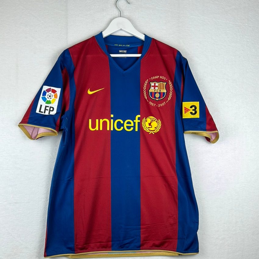 2007–08 Barcelona Home L/S Shirt – Authentication Guide⸻Shirt OverviewTeam: FC BarcelonaSeason: 2007–08Type: Home (Long Sleeve)Manufacturer: NikePrimary Colours: Claret and Blue vertical stripesNotable Match: Worn in La Liga and Champions League matchesNotable Players: Lionel Messi, Xavi, Andrés Iniesta, Thierry Henry, Carles Puyol ⸻Key Authentication FeaturesNike Swoosh: Yellow stitched swoosh on right chest.Crest: Barcelona club crest with…