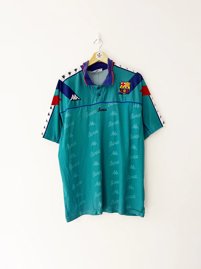 1992–95 Barcelona Away Shirt – Authentication Guide⸻Shirt OverviewTeam: FC BarcelonaSeason: 1992–1995Type: AwayManufacturer: KappaPrimary Colour: Turquoise with purple and red detailingNotable Match: Real Madrid 0–5 Barcelona (January 1994) ⸻Key Authentication FeaturesCrest: Fully embroidered F.C.B. crest with yellow backing and crisp detail. Red and blue segments stitched sharply with gold border.Kappa Logo: White embroidered Kappa ‘Omini’ logos…